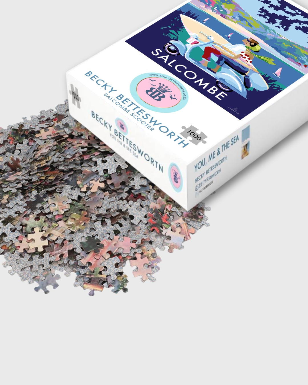 Salcombe Scooter travel poster and seaside print by Becky Bettesworth. This delightful Salcombe Scooter print is an adaptation from the commission that Becky did for The Bakehouse in Salcombe. This enchanted picture is full of fun, colour, and a vest for life, with a 1950s twist. Oozing a care-free holiday feel with a hint of glamour and sophisticated style, with the stunning beaches of East Portlemouth in the background, including Sunny Cove and Fisherman's Cove across the stunning Salcombe estuary.